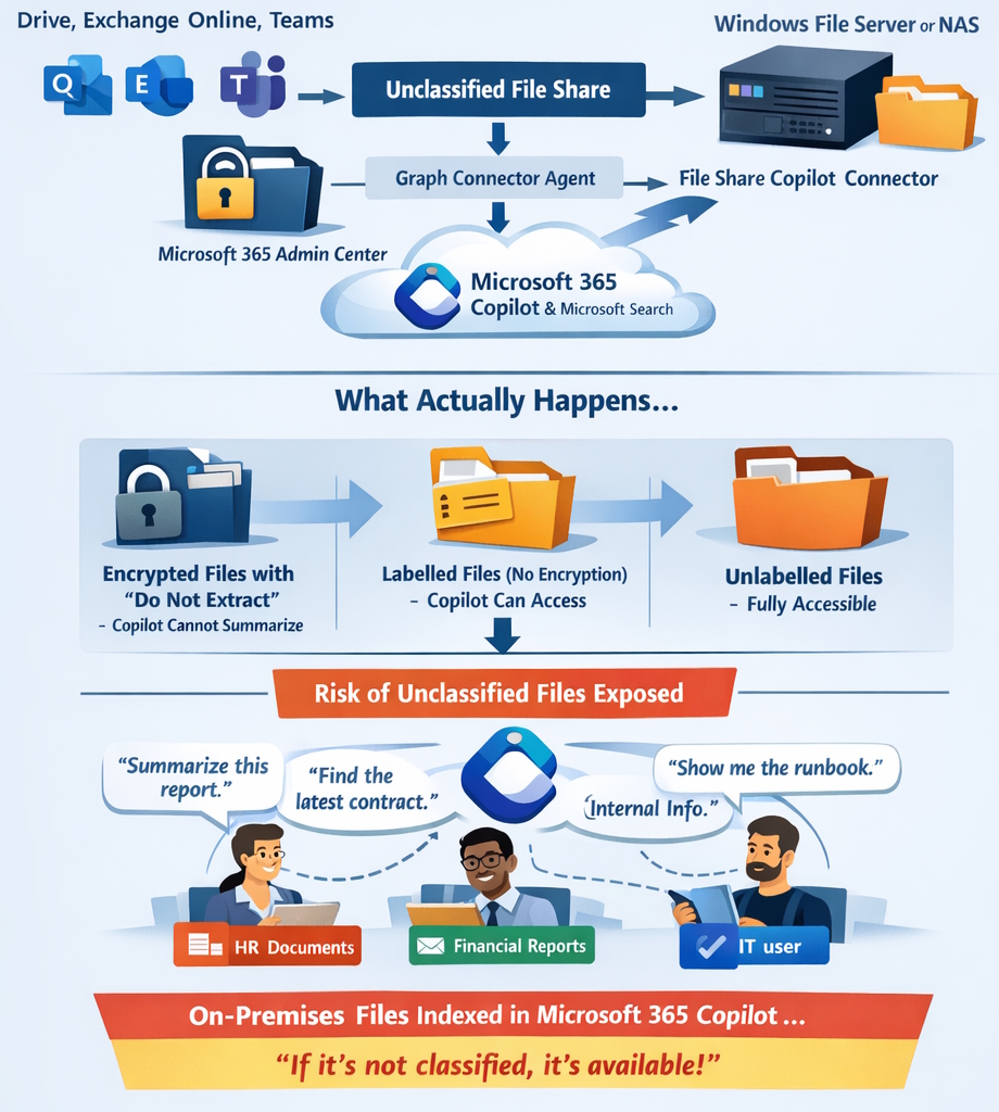 The consequence is straightforward: if you connect your on-premises file shares to Microsoft 365 Copilot before classifying their contents, you are making years of unclassified files (contracts, HR documents, financial models, internal communications) usable by anyone with read access and a Copilot licence.